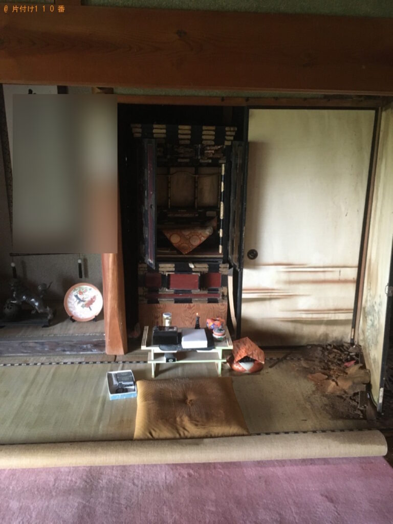 担当のコメント | 仏壇、お位牌、遺影の処理にお困りのお客様からご相談いただきました。見積り額がご予算内だったことがご依頼の決め手になったようです。片付け110番では、御霊抜きも承っております。不用品がございましたらまたいつでもご相談ください。 |